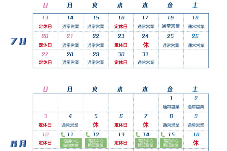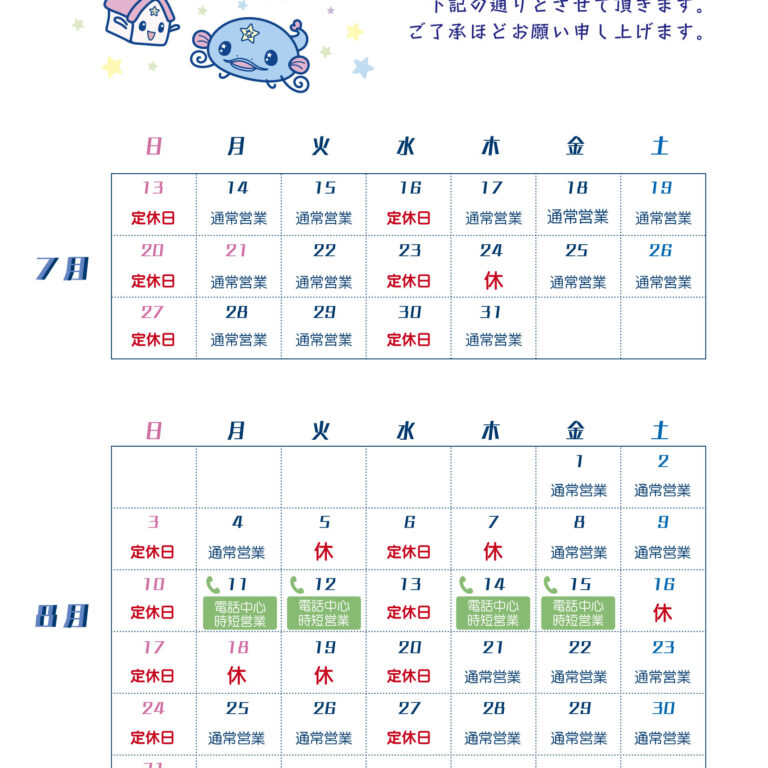 夏季営業日のおしらせです。 別紙の日程で営業させていただきます。 ※日曜日と水曜日は定休日です 休業中の緊急対応・伝言等につきましては、 賃管サービスセンター 03-3988-3432 にお願いします。 ※出動内容によっ…