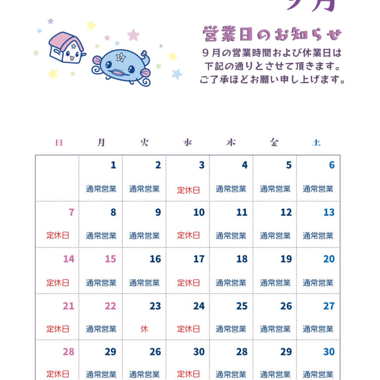 9月の営業日のおしらせです。 別紙の日程で営業させていただきます。 ※日曜日と水曜日は定休日です 休業中の緊急対応・伝言等につきましては、 賃管サービスセンター 03-3988-3432 にお願いします。 …