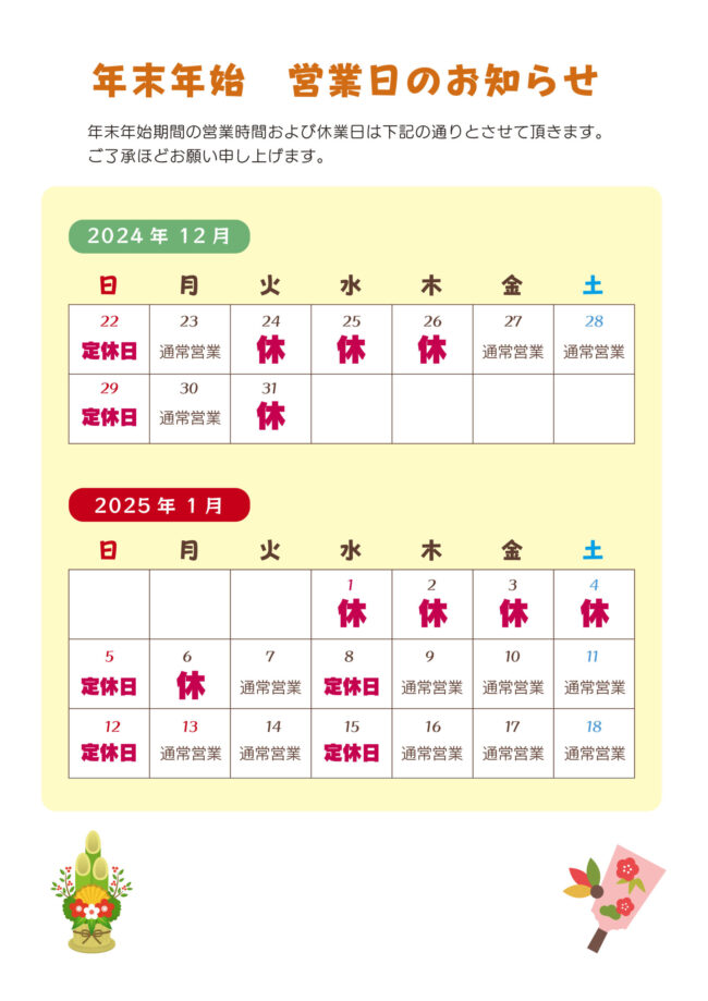 年末年始の休業日のお知らせ