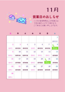 11月の営業日のおしらせです。