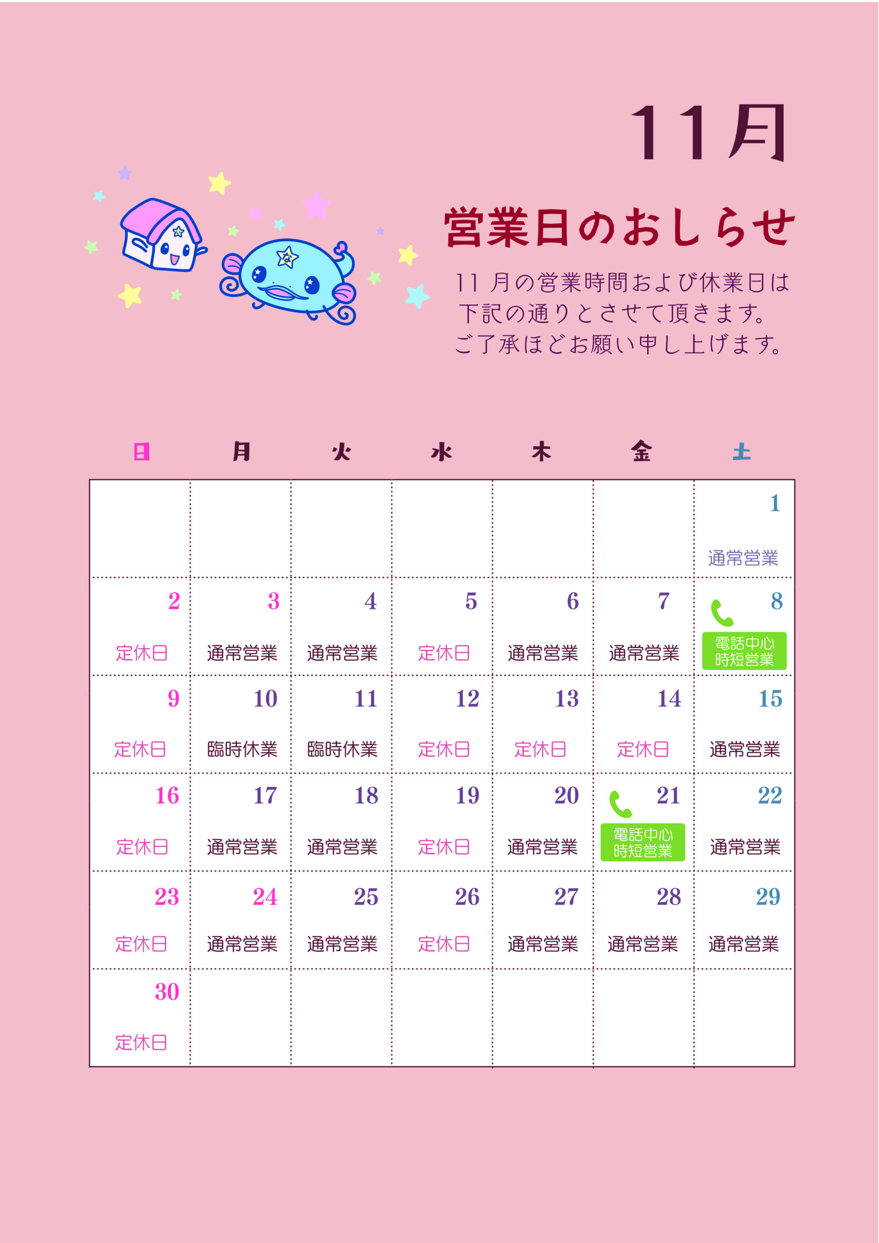 11月の営業日のおしらせです。