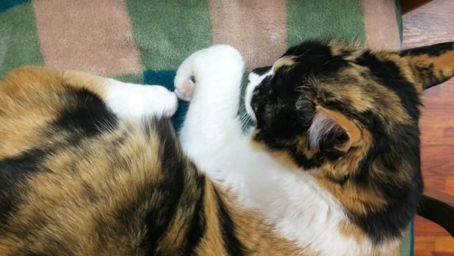今日のミッコは膝の上にいました。 お決まりの謎手首をした姿勢でくつろぎ、 ゴロロロロロロ…。 わたしもつられて眠くなってしまいます。 そのままお手入れを始めたのですが… 撮影したら、高速で首を…