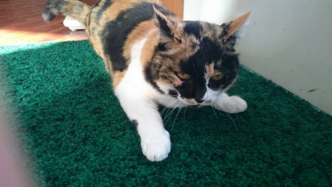 ミッコさんは今日も定時で出勤です。 謎のポーズでマットへ。 しぐさがかわいいのに常に三白眼なところがポイントです。 背筋を伸ばしてテレビ鑑賞中。 楽しいのでしょうか?(笑) 外ではパンダが丸く…