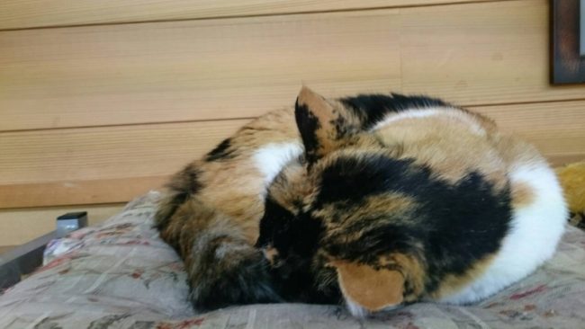 ミッコ、大あくび。 こんな顔見ていると、こちらも眠くなってきますね。 のびにのび~て… …… 寝ました。 基本、いつもゆっくり寝ています。