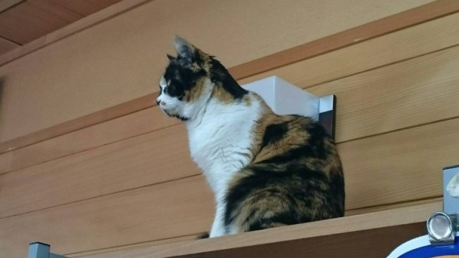 今日のミッコは仕事する気があるようです。 テーブルにヒラリと上がり… おすすめの物件はこちら…らしいのですが、全く見えませんね! しかも半目(笑)
