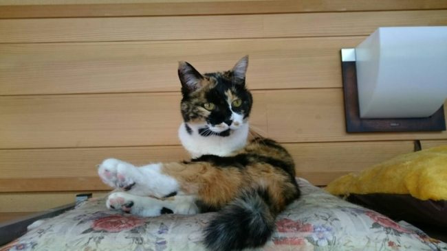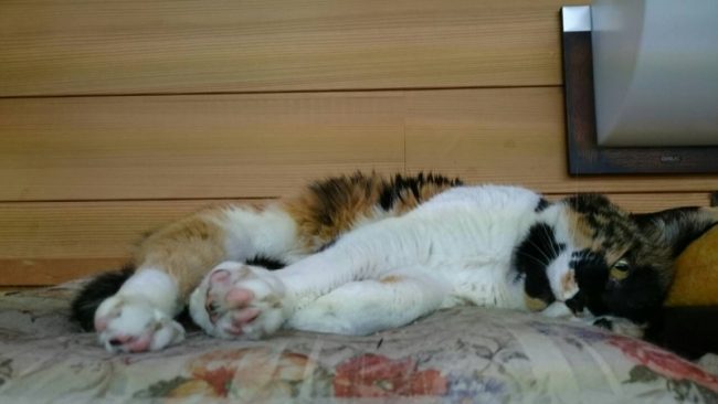 日に日に寒さが厳しくなってきましたね。 ミッコは室内の暖かい場所を把握しているので、 朝はあっち、昼はここ、夕方はそっち…と、 時間毎に移動しては寝ています。 暖かいなら床にもゴローンと…。 …
